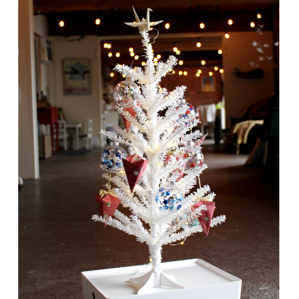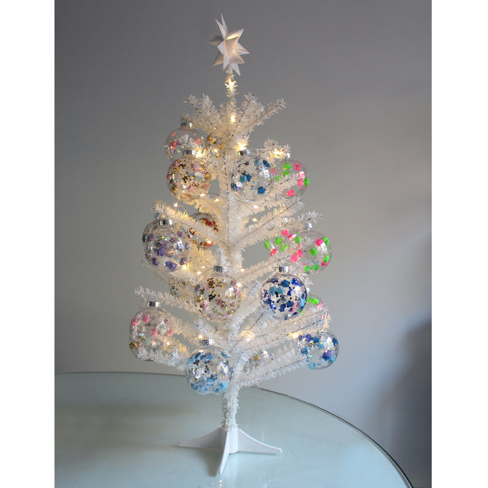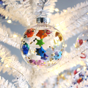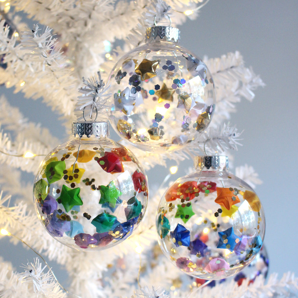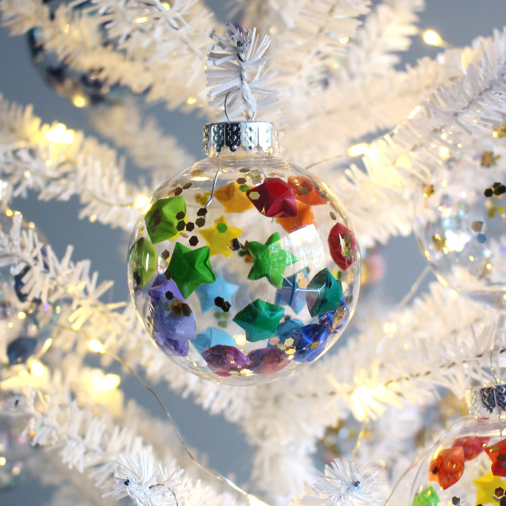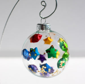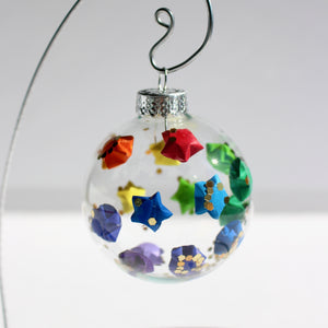 Made to order bulb ornaments that are sure to fill everyone with awe and wonder as they add some sparkle to your tree this year. These ornaments are clear and filled with origami lucky stars and chunky glitter. Rainbow stars in solids in solid colors with chunky gold glitter.