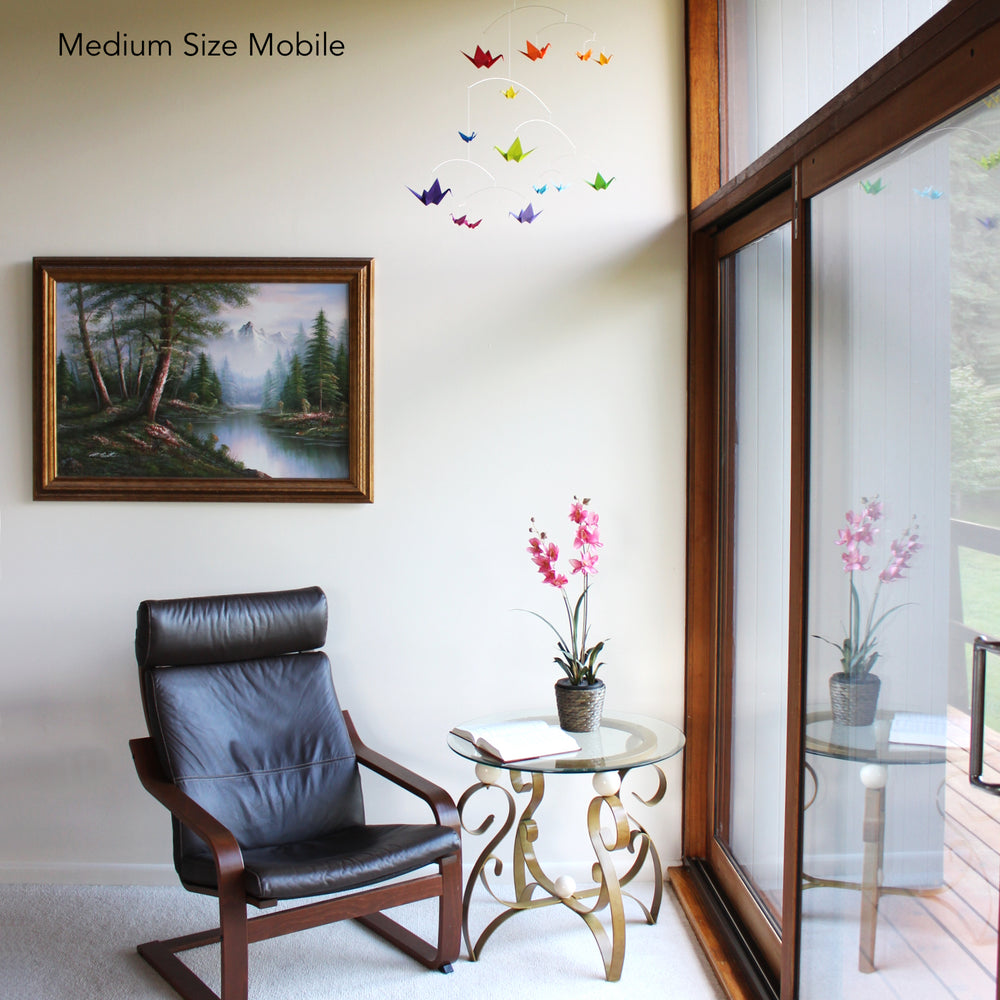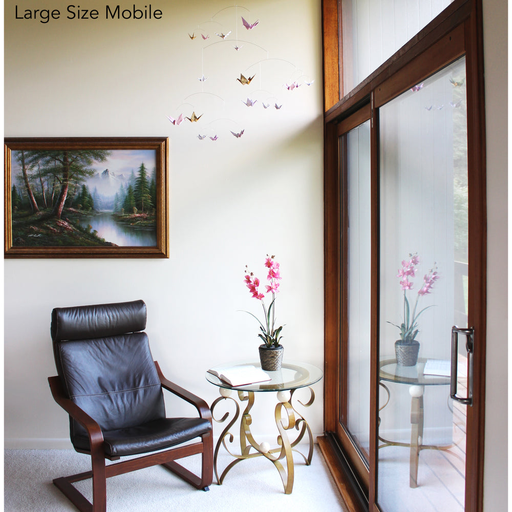 This mobile provides a great way to accent a room in your home, liven up an office, provide you with a way to relax at work, decorate a child's bedroom, or turn a nursery into a magical place. Babies are fascinated by the complexity of these mobiles and the way they move. Your baby will happily gaze up at a collection of intricately folded paper models that move freely in any direction. The birds are always in kinetic motion even when the air is still, and the slightest breeze makes them dance. Watching the origami paper mobile in motion is so relaxing and intriguing - leaving anyone guessing the path the models will take next.