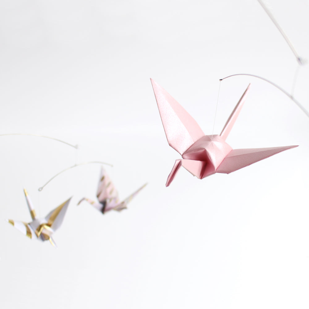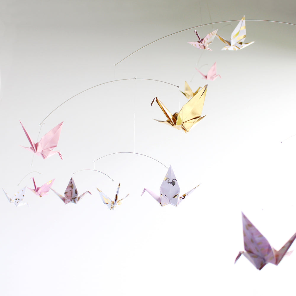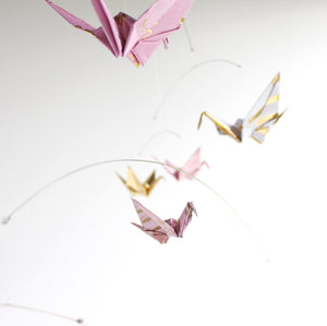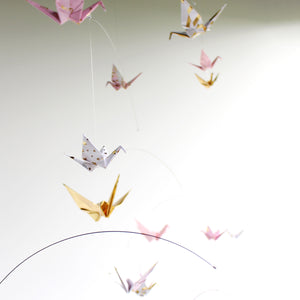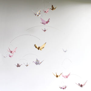 This Paper Crane Mobile has cranes folded from papers with prints in a variety of pink and gold papers (some prints may vary from what you see in the pictures). Â It is handmade with care and makes a colorful addition to any room, whether an office at work, a newborn nursery, or any space that needs a little whimsical decor.