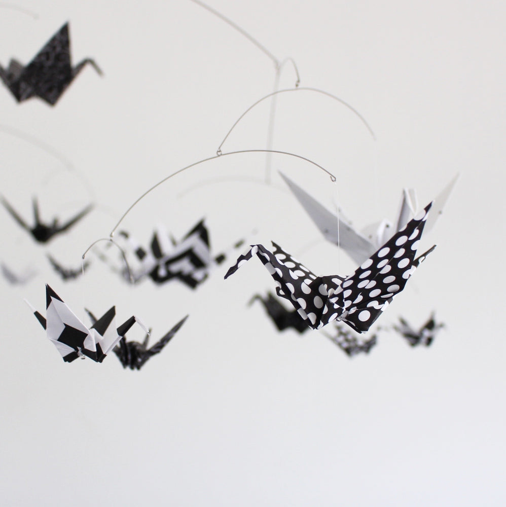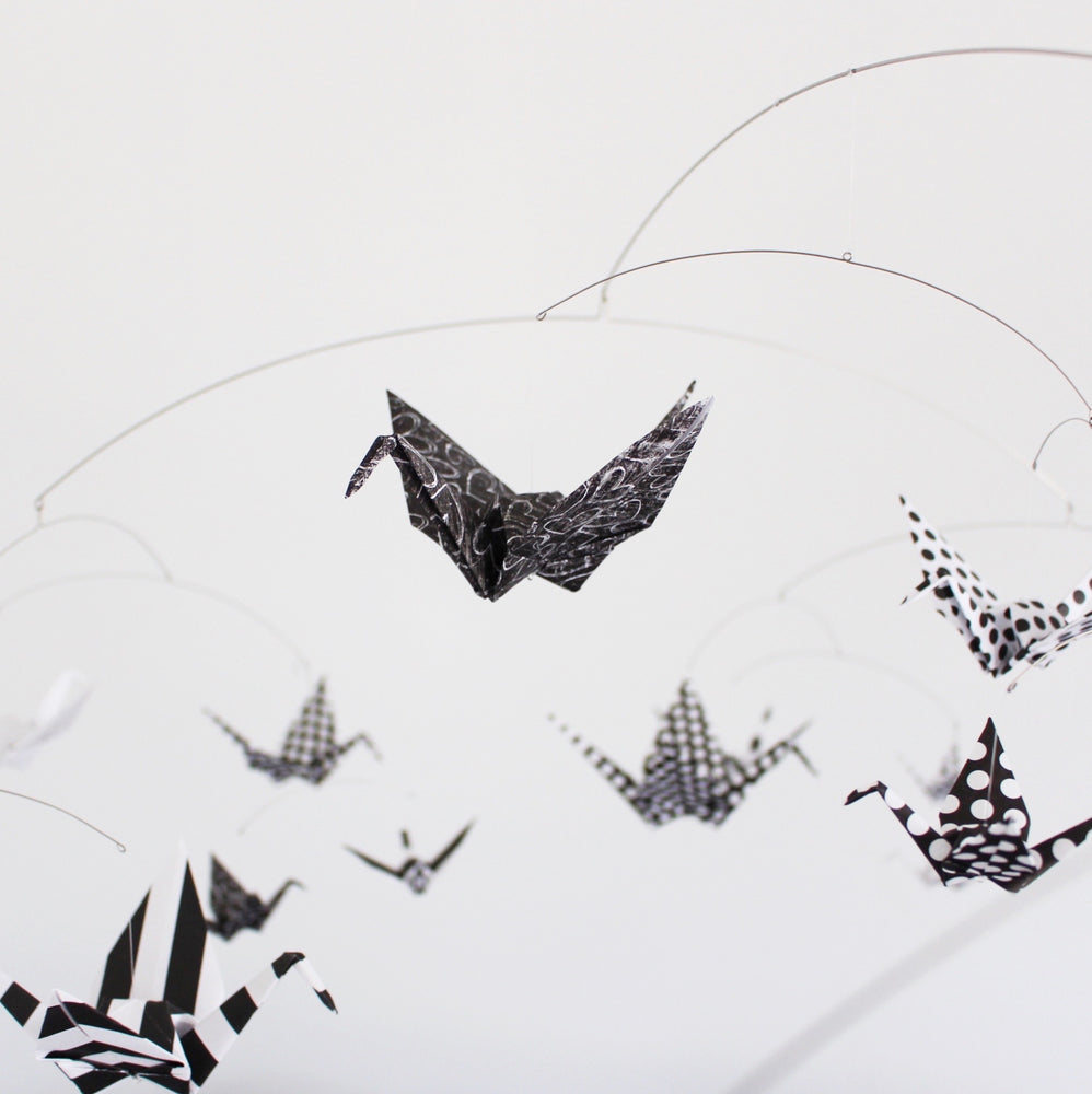 This mobile provides a great way to accent a room in your home, liven up an office, provide you with a way to relax at work, decorate a child's bedroom, or turn a nursery into a magical place. Babies are fascinated by the complexity of these mobiles and the way they move. Your baby will happily gaze up at a collection of intricately folded paper models that move freely in any direction. The birds are always in kinetic motion even when the air is still, and the slightest breeze makes them dance. Watching the origami paper mobile in motion is so relaxing and intriguing - leaving anyone guessing the path the models will take next.