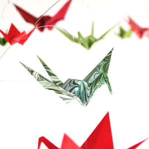 ○ This origami mobile has 28 origami paper cranes folded from 3x3, 4.5x4.5, and 6x6 inch sheets of archival paper in any colors or prints you'd like.