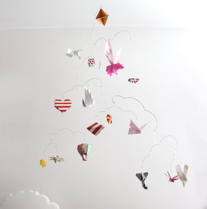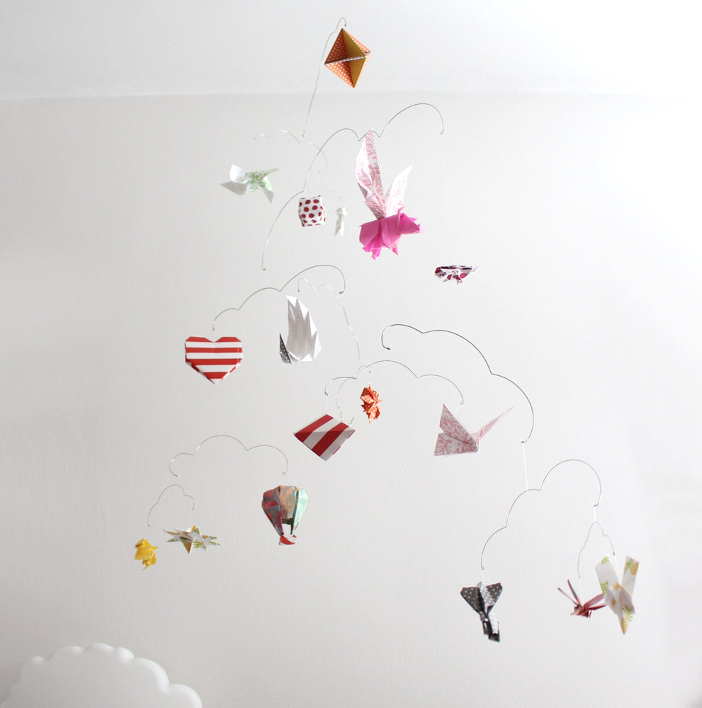 This Large Cloud Wire Customizable Origami Paper Mobile is handmade with care and makes a colorful addition to any room, whether an office at work, a newborn nursery, or any space that needs a little whimsical decor. All the stainless steel wires are hand shaped into clouds. This particular mobile was made for my new baby niece and she absolutely loves it! Email me with a list of the models you would like in your cloud wire mobile.