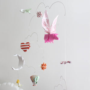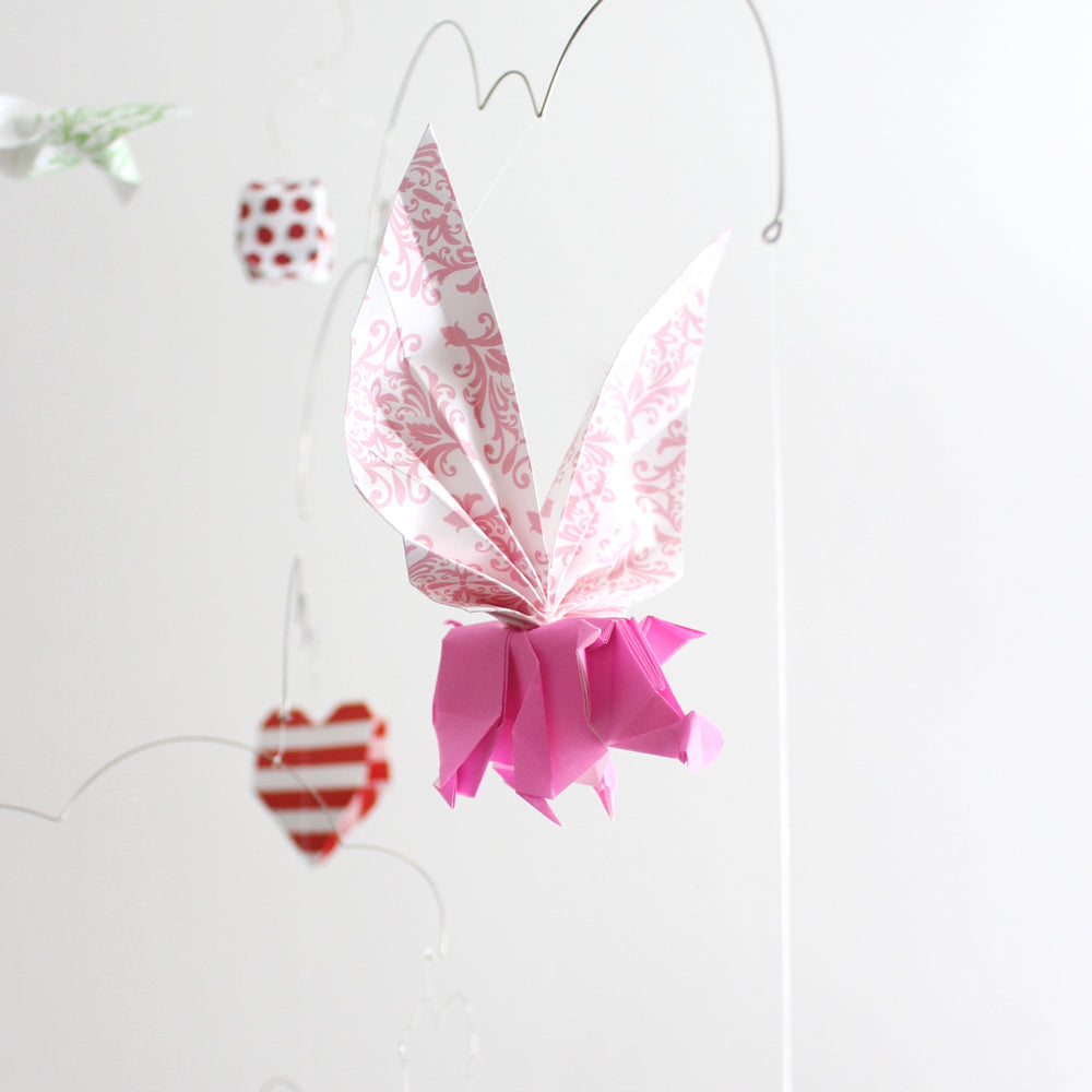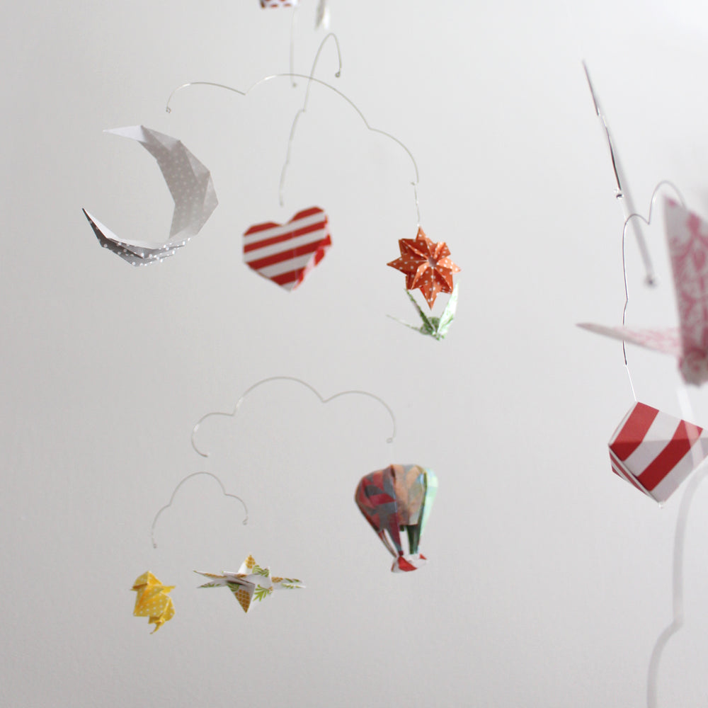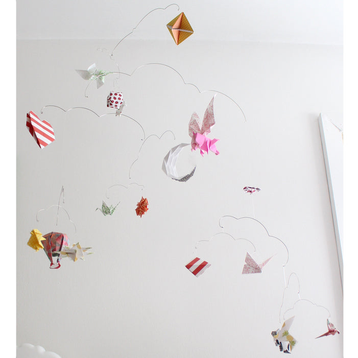 These mobiles provide a great way to accent a room in your home, liven up an office, provide you with a way to relax at work, decorate a child's bedroom, or turn a nursery into a magical place. Babies are fascinated by the complexity of these mobiles and the way they move. Rather than having a simple plastic mobile that always rotates in one direction, your baby could be gazing up at a collection of intricately folded paper models that move freely in any direction. The models are always in kinetic motion even when the air is still, and the slightest breeze makes them dance. Watching the origami paper mobile in motion is so relaxing and intriguing - leaving anyone guessing the path the models will take next.