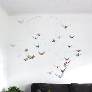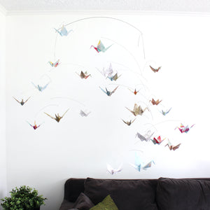 ○ GIANT SIZE: There are 24 origami paper cranes on this hanging origami mobile. Paper cranes are folded from acid free paper of various sizes (6x6 inch - 9x9 inch sheets). This mobile measures 4 feet in width and 3 feet in height.