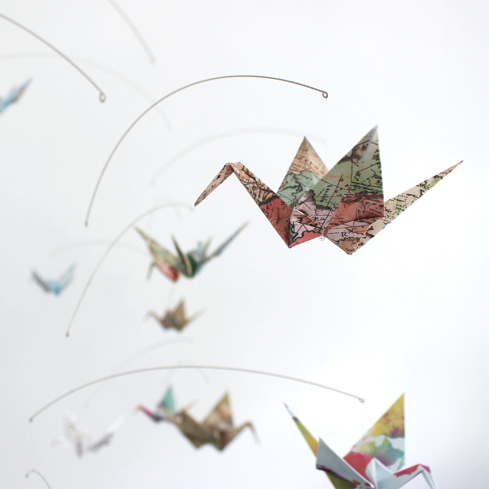The map print paper used in this mobile is perfect for any room inspired by travel and adventure. The soothing colors in this mobile make it a great addition to a nursery, office, or any other room in your home.