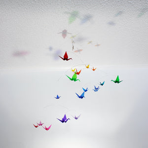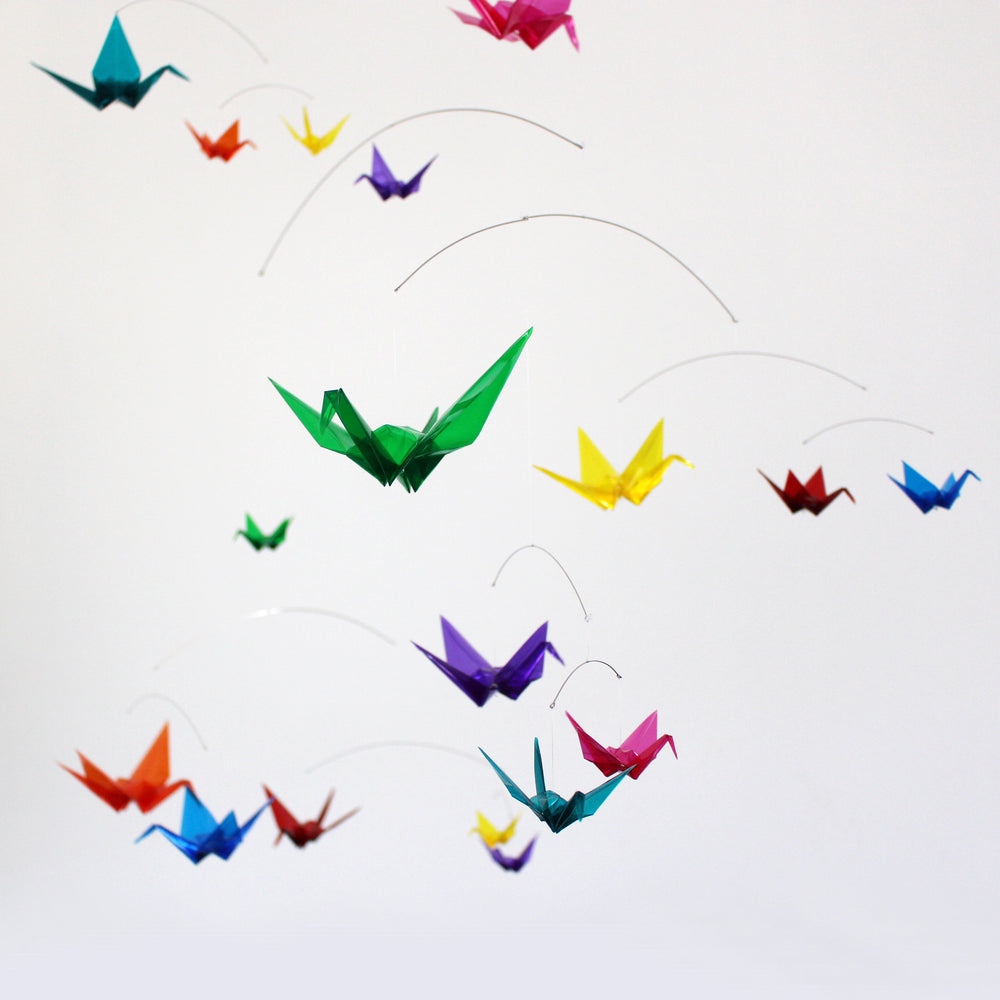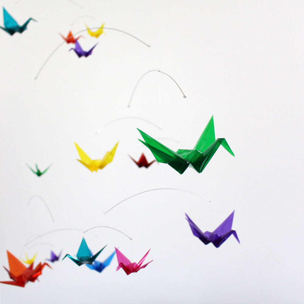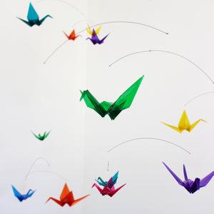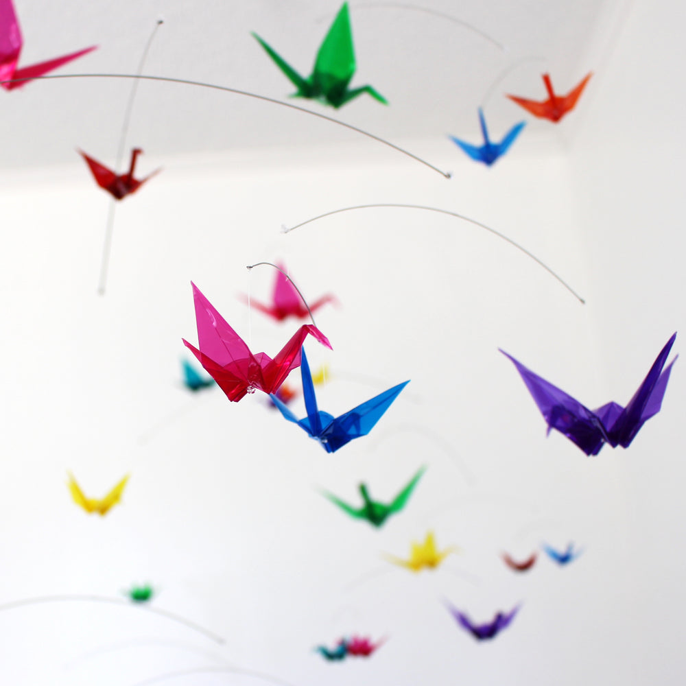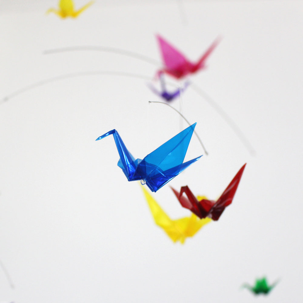 ā Each origami paper crane is folded from clear colored plastic/acrylic filmĀ of various sizes.